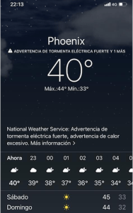 Resulta que no bien bajamos del avión en el aeropuerto de Phoenix se desató una tormenta de tierra y nuestros celulares acusaron recibo de la advertencia sonora del Servicio Meteorológico de que se debía parar los automóviles al costado de la carretera y no intentar manejar sin visibilidad. El viento cálido (40 *C a las diez de la noche) y cargado de tierra nos dio la bienvenida al Estado mas desértico de los Estados Unidos. Y que nos prometía 45 *C para el día siguiente.