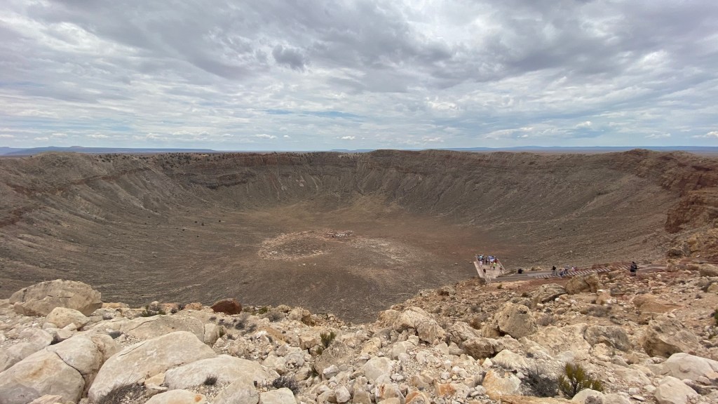 Otro espectáculo único y sorprendente es el Cráter del Meteorito, un agujero en medio del desierto provocado por el impacto de un cuerpo celeste que mide 1600 metros de diámetro y 170 de profundidad.