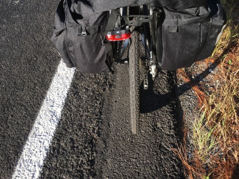 Una buena parte de la Ruta 17 fue recientemente repavimentada, y la nueva carpeta es sumamente rugosa y hace que la bicicleta vibre demasiado (vibrar es consumo extra de energía, y reduce el confort). Pero una angosta franjita (20 -30 cm de ancho) entre la raya lateral blanca y el pasto de la banquina conservaba el pavimento viejo, mucho más liso. La cuestión es que para no sacudirme como un condenado decidí viajar por la frenjita, y debo decir que al cabo de los 30 km que duró el operativo estaba como para superar un casting en el Cirque du Soleil. Si alguno desea aprender a andar derechito en bicicleta, ese es el lugar.
